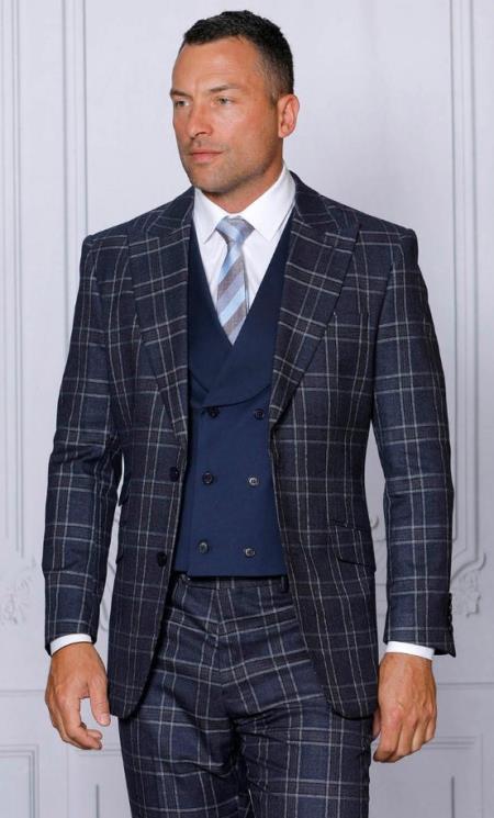 Mens Midnight Blue Plaid Peak Lapels Suit Tailor Fit