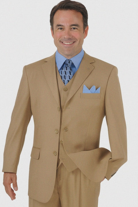 Men's 3-Button Khaki Vested Wool-Feel Suit
