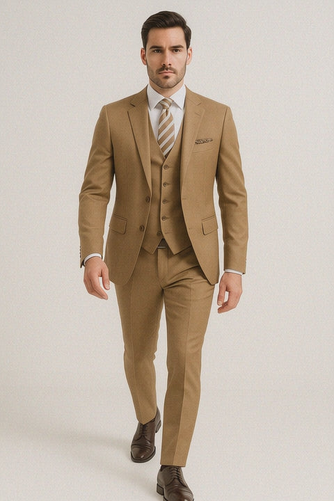 Make a lasting impression with this expertly tailored tan three-piece suit — a perfect balance of modern sophistication and classic design. Whether you're dressing for a wedding, business meeting, or upscale event, this suit offers premium comfort and refined style in one complete package. The slim yet structured silhouette enhances your frame, while the neutral tan color brings versatility and distinction to your wardrobe.