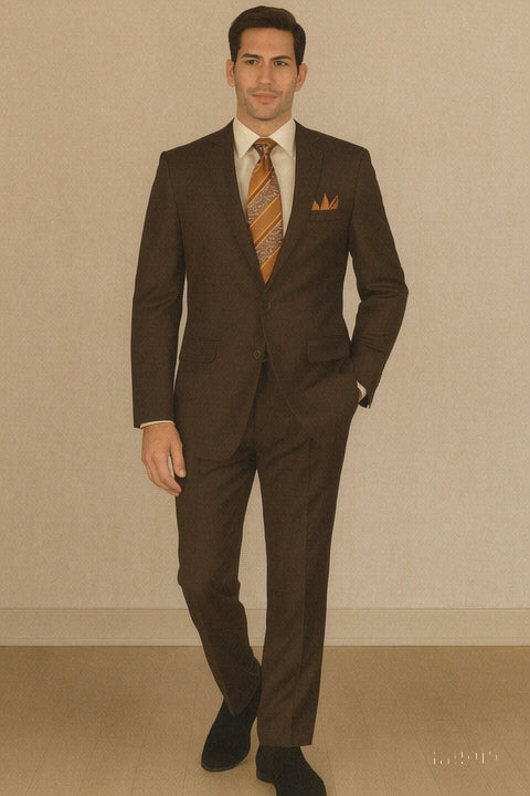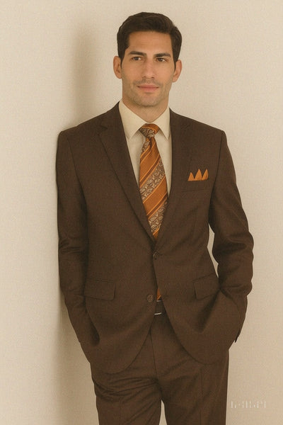 - Elevate your formal wardrobe with the 2TR Classic Fit Executive Cut Solid Brown Suit, expertly tailored for men who value structure, comfort, and timeless elegance. Made from 100% lightweight worsted poly-rayon blend, this suit features a two-button jacket with a refined notch lapel, canvas chest piece, and very low button stances for a modern executive look. The satin lapels, self-flap pockets, and welt chest pocket offer a polished appearance, while the pleated pants come with inner linings, a slanted and tapered cut, and an unhemmed bottom for easy customization. Designed with a point-to-point shoulder measurement, this suit gives a slim and flattering silhouette, making it ideal for men with a slender frame. Its classic styling with a modern edge makes it a perfect fit for business, formal occasions, or high-end events