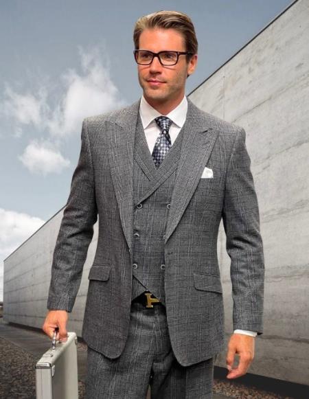 Athletic Suit - Classic Fit Charcoal Grey Windowpane - Plaid Suit Classic Fit Wide Leg Pleated Pants Super 150's Wool Fabric