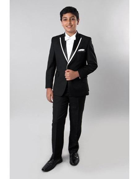 Boy's Kids Sizes 2 Piece Black Tuxedo - Satin Lapel with Fabric Trim Perfect for toddler Suit wedding attire outfits