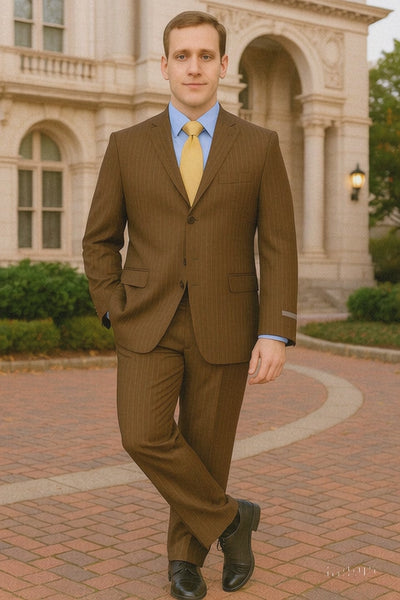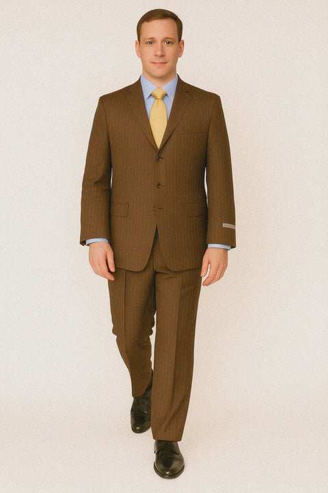 Brown Pinstripe Feel Poly-Rayon Three ~ 3 Buttons Style Suit Pleated Pants