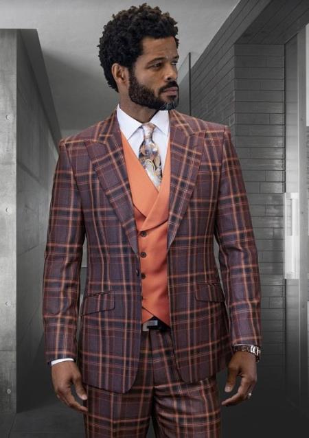 Brown Plaid Suit - Copper - Orange - Rust Color Windowpane Pattern Suit - Wool Suit - Peak Lapel Side Vented Modern Fit
