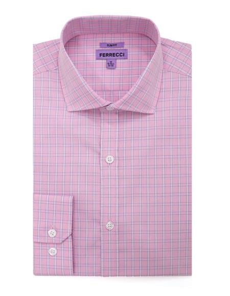 Checked Pattern Pink Men's Dress Gingham Shirt - Checker Pattern - French Cuff - White Collared + Free Bowtie