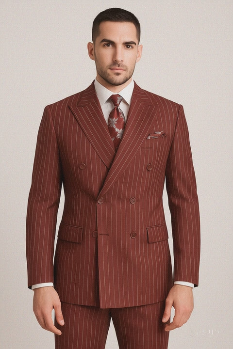 Pair this maroon double breasted suit with a crisp dress shirt and tie for a commanding formal look, or style it with a turtleneck for a refined modern twist.