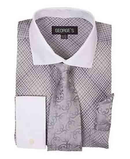 French Cuff Silver Mini Plaid/Checks White Collar Two Toned Contrast Shirt With Tie And Handkerchief Men's Dress Shirt
