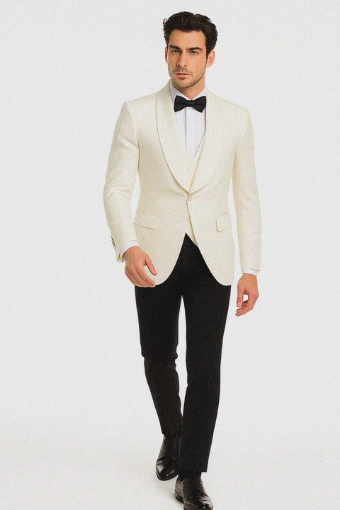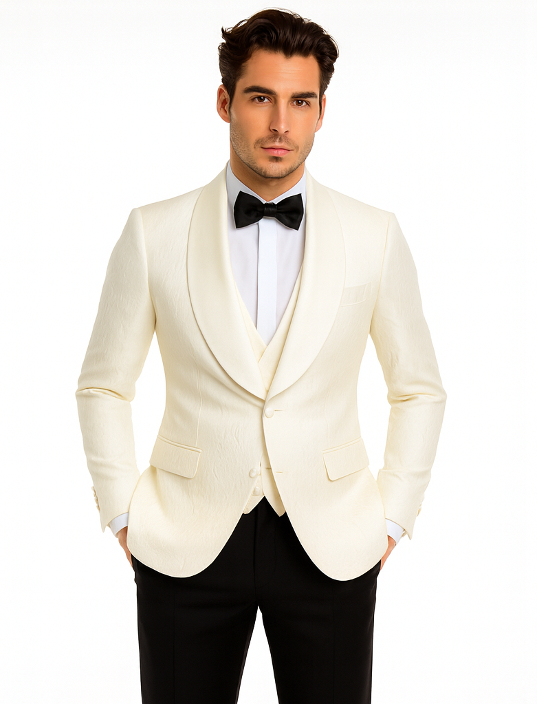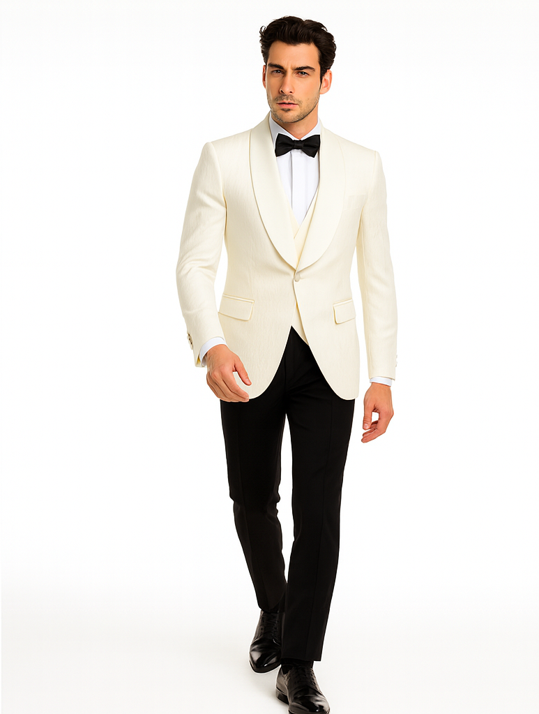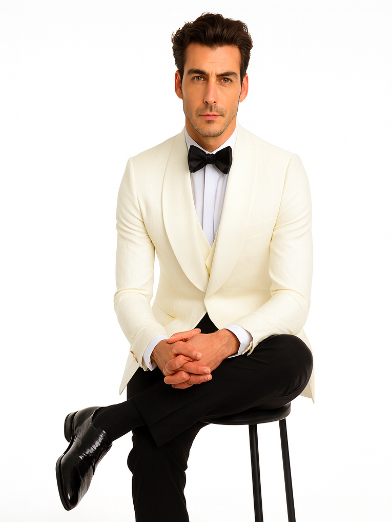 Pair the ivory dinner jacket with black tailored tuxedo trousers, a crisp white dress shirt, and a black bow tie. Finish with polished black patent leather shoes for a timeless black-tie look. -