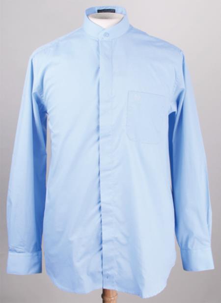 Light Blue Oriental Mao Chines Style collarless Mandarin Preacher Banded Collar Men's Dress Shirt