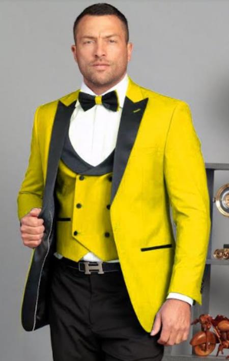 Mens 1 Button Yellow Tuxedo - Peak Lapel With Double Breasted Vest