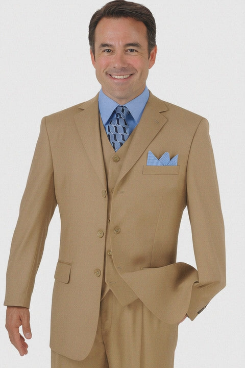Mens 3 Button Vested Basic Wool Feel Suit in Khaki