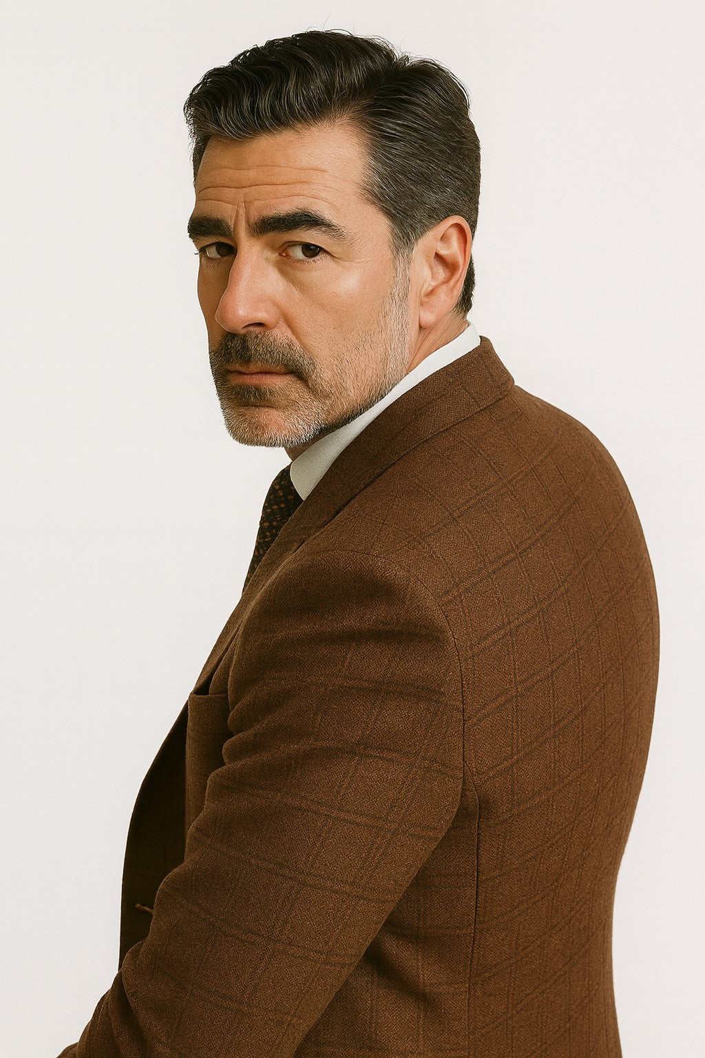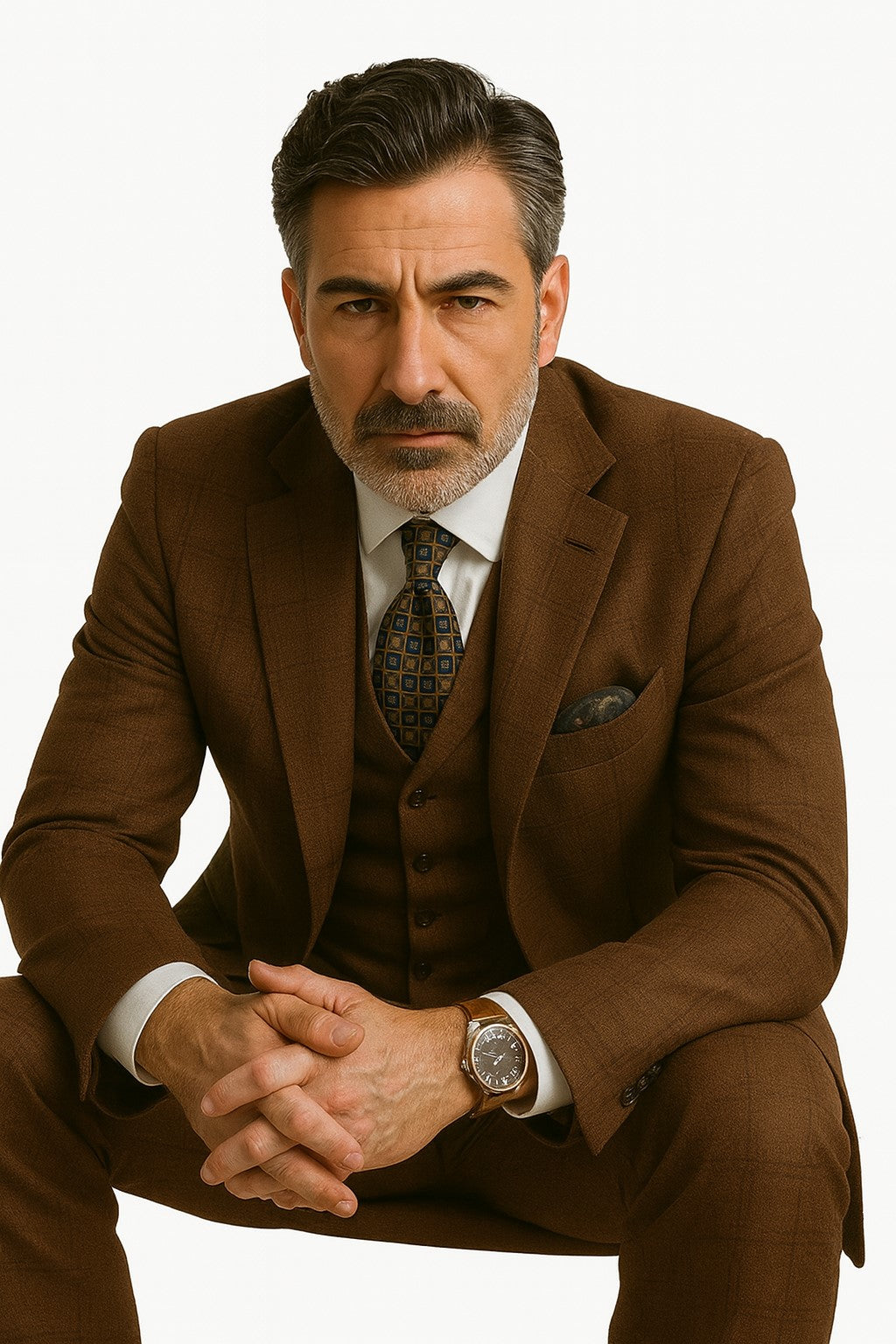 Men’s Brown Plaid 3-Piece 1920s Fashion Suit with Scoop Vest – Vintage Style Wedding & Formal Attire