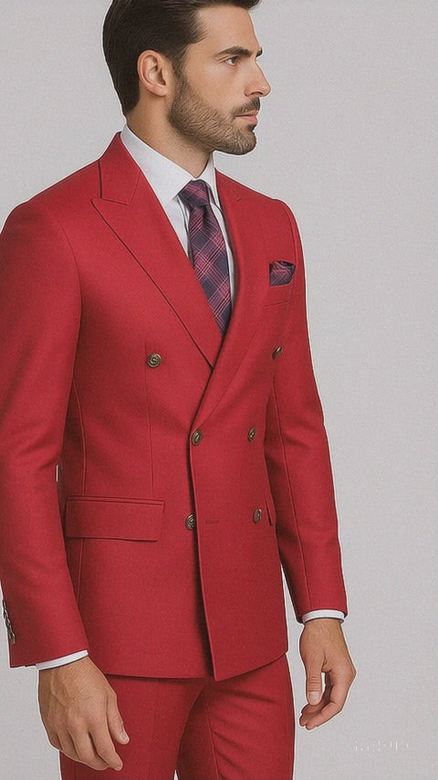 Turn heads with this bold men’s red double breasted blazer, a modern take on classic tailoring that exudes confidence and style. Designed with precision, this sport coat features a sharp slim-fit cut, structured shoulders, and peak lapels that highlight masculine elegance. The double breasted front with gold-tone buttons adds a touch of sophistication, making it a versatile piece for both formal and smart-casual occasions.