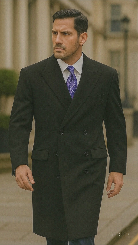 The jet black color makes this coat incredibly versatile, pairing effortlessly with business suits, evening wear, or casual smart outfits. Its double-breasted design and peak lapels channel old-world charm with a modern twist, perfect for men looking to make a bold fashion statement.
