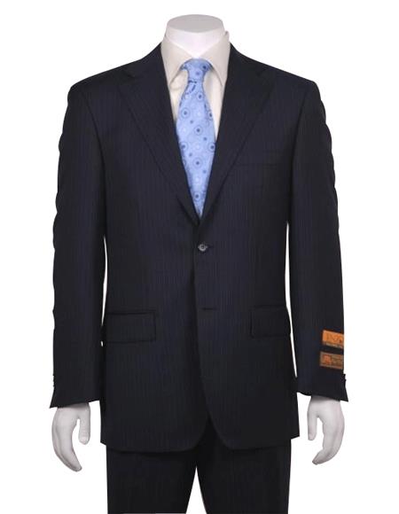 Men's Flat Front Super 150's Poly~Rayon Dark Navy Stripe Modern Fit 2 Button without pleat Cheap Priced disc