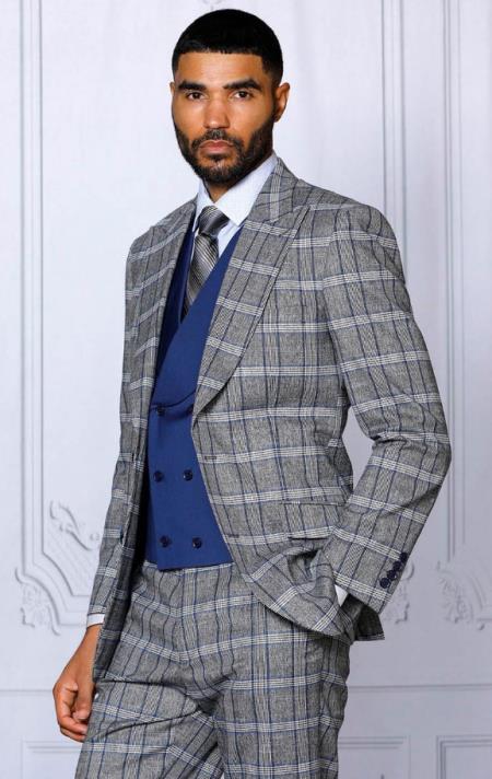 Mens Sapphire Blue Plaid Peak Lapels Suit Tailor Fit