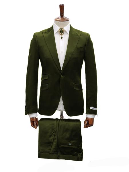 Mens Shiny Blazer - Olive Green Sateen Vested Suit