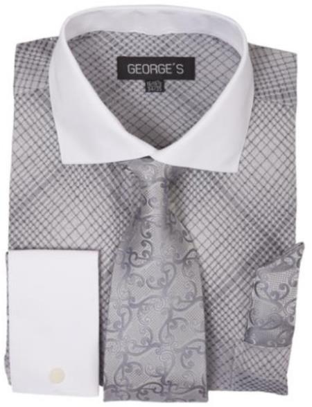 • Silver Long Sleeve White Collar Two Toned Contrast Check Pattern Fashion Tie Set Men's Dress Shirt