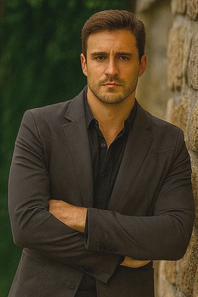 The slim-fit silhouette is tailored to accentuate the male physique without feeling restrictive. It features structured shoulders, a tapered waist, and a clean back design, giving it a modern edge while still honoring Western style traditions. The front showcases a two-button closure, classic notched lapels, and subtle stitching details that enhance its rugged appeal. The blazer also includes flap pockets for functionality, as well as a welt chest pocket that’s perfect for adding a pocket square or personal touch.