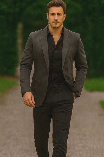 The Men’s Slim Fit Western Blazer in Charcoal is perfect for pairing with dark denim for a polished casual look, or with tailored trousers for an upscale Western-inspired formal outfit. Add a bolo tie or a leather belt with a statement buckle to embrace its cowboy heritage, or keep accessories minimal for a sleek, modern style.