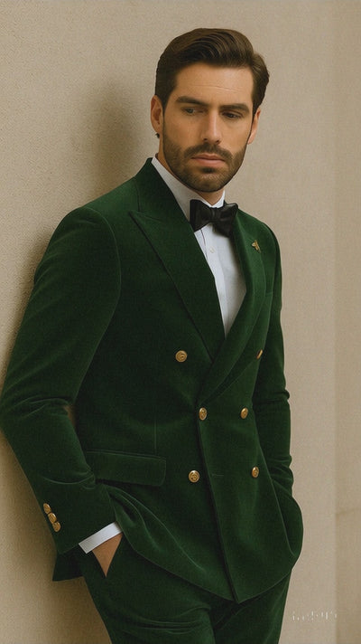 Make a bold entrance with the Men’s Velvet Suit in Green, a luxurious slim-fit double-breasted suit designed for modern sophistication and timeless style. Crafted from premium velvet fabric, this suit offers a soft, rich texture that exudes elegance while ensuring comfort and durability. The deep emerald green shade creates a striking yet refined look, perfect for evening events, formal occasions, weddings, and upscale gatherings.
