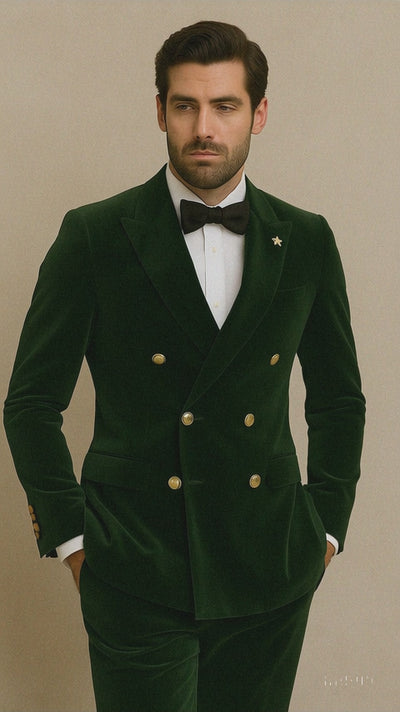 Mens Velvet Suit - Slim Fit Double Breasted Suit Blazer and Pants - Green