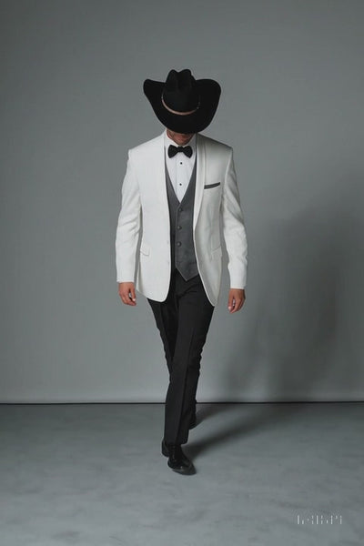 Make a bold statement with this Mens White Cowboy Tuxedo, designed for modern Western flair.The suit features a classic single-breasted jacket with a refined button closure.A smooth shawl lapel adds a touch of sophistication to the clean white silhouette.The tailored fit ensures a sharp, structured look ideal for formal or themed events.Equipped with a chest pocket and sleek besom front pockets for timeless style.Crafted in premium fabric, this cowboy suit balances rugged charm with elegance.Perfect for weddings, Western galas, or standout fashion moments.