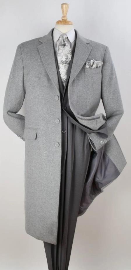 Men's 100% Wool Full Length Length Top Coat - Hidden Button Light Grey