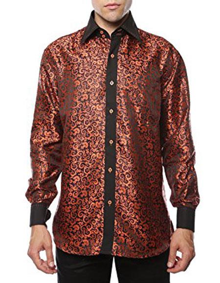 Orange Black Shiny Satin Floral Spread Collar Dress Shirt