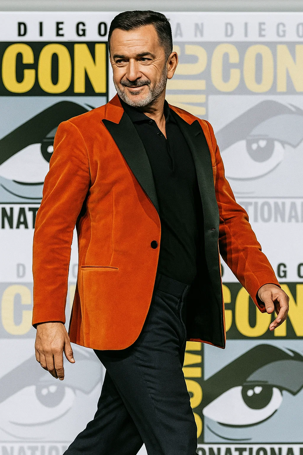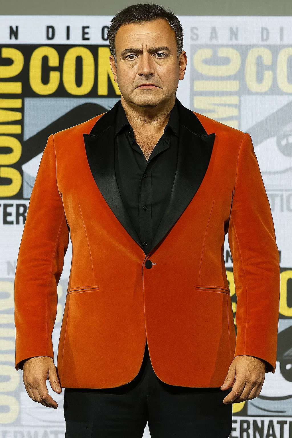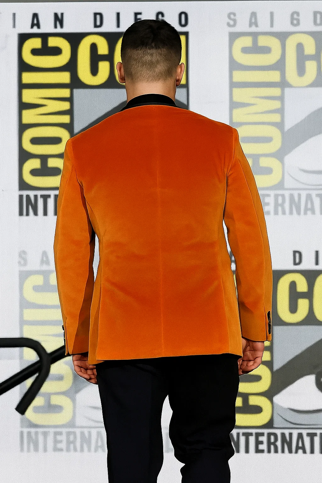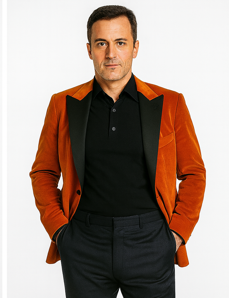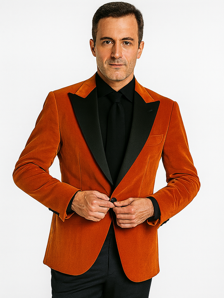 Men’s Orange 1-Button Blazer – Classic Fit Single-Breasted Jacket with Black Peak Lapel