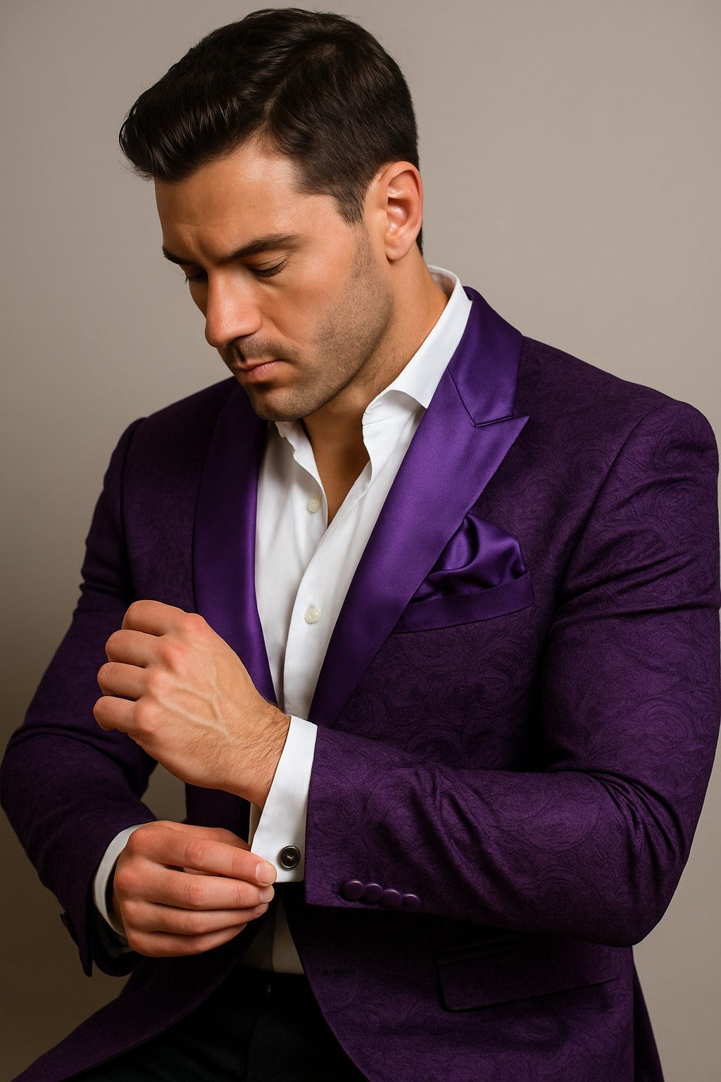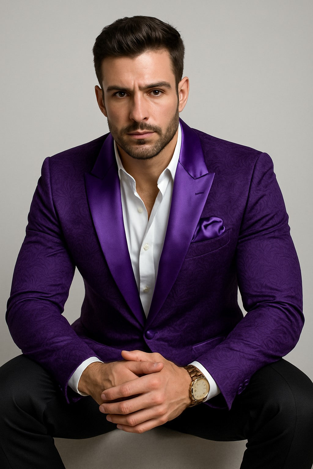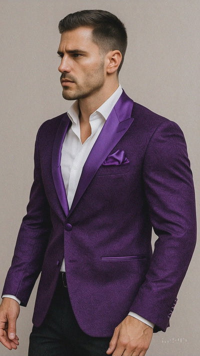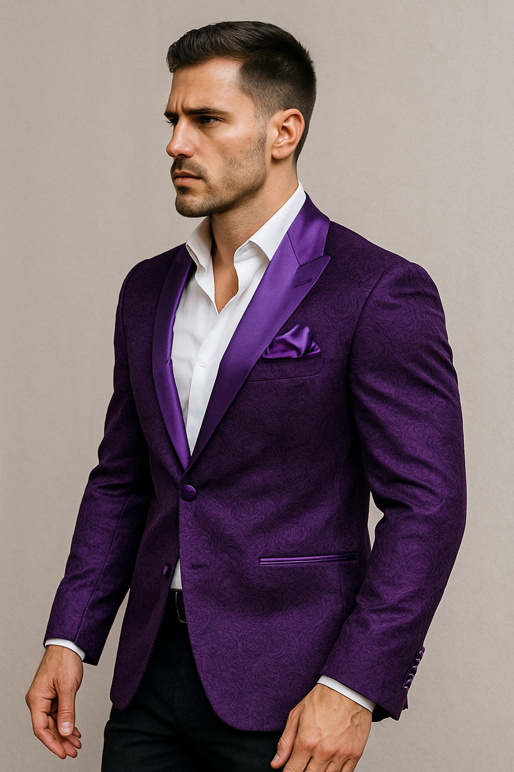 Make a bold fashion statement with this Paisley Floral Blazer in Midnight Plum, a standout tuxedo jacket designed to bring elegance, personality, and modern flair to any occasion. Crafted with a richly textured paisley floral pattern, this men’s blazer exudes confidence and charm, making it the perfect choice for weddings, proms, formal parties, or stylish nights out.