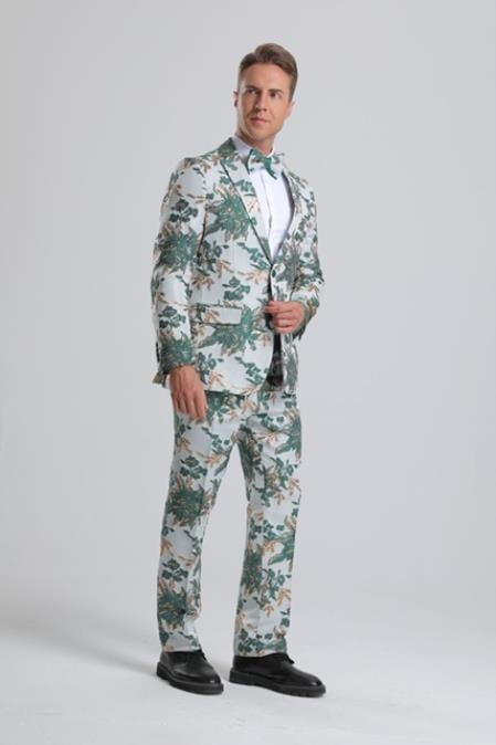 Paisley Suits - Wedding Tuxedo - Groom Green ~ White Suit + Matching Bowtie