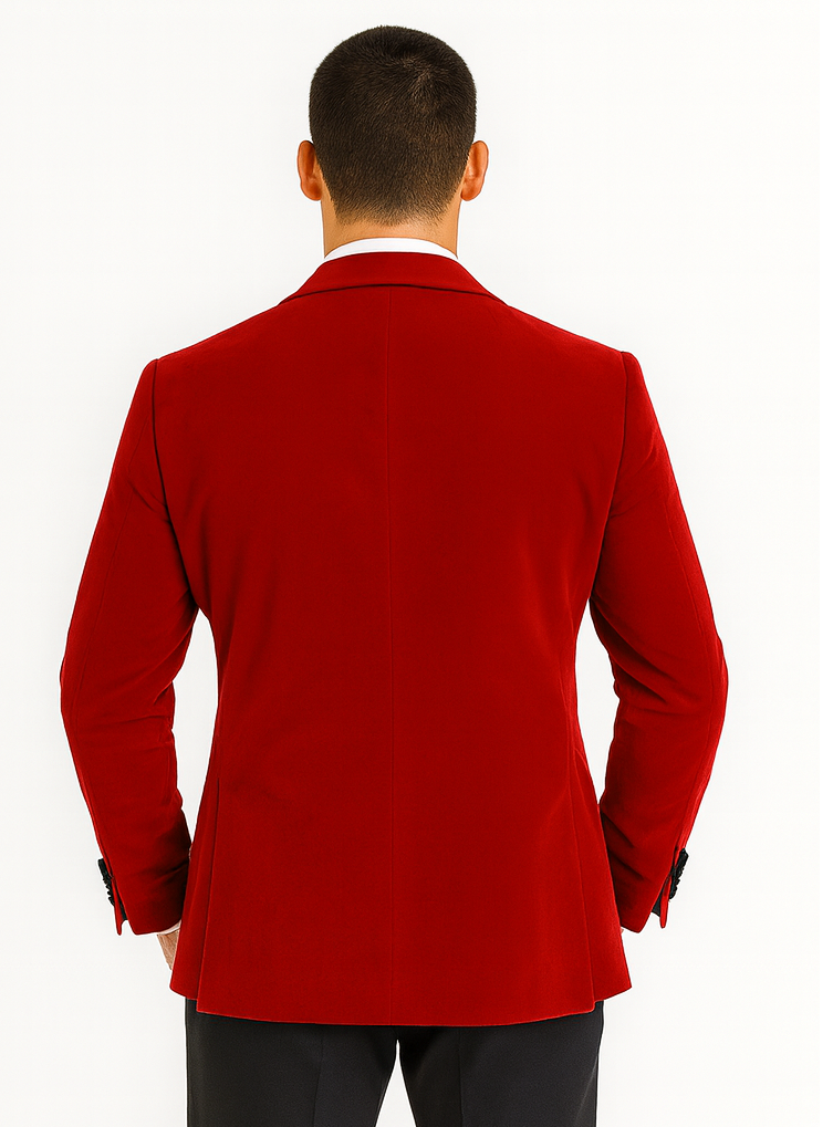 This red velvet tuxedo jacket is styled with a peak lapel for a formal edge, a single chest pocket perfect for a pocket square, and two flap front pockets that combine utility with elegance. Every detail is designed to elevate your style.