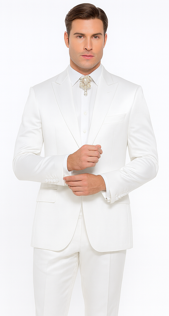 The pure white color of this suit symbolizes elegance, purity, and confidence, making it an ideal choice for weddings, high-end celebrations, and red-carpet events. The tone offers a fresh, contemporary alternative to traditional black or navy suits, ensuring you stand out effortlessly while maintaining a sophisticated presence. The LEO RM1601 captures light beautifully, creating a luminous look that reflects the wearer’s refined taste and attention to detail.