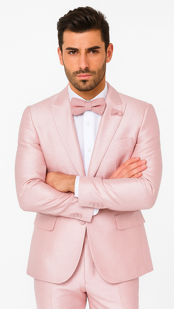 Style the LEO RM1641 Pink Shimmer Suit with a white or light blush dress shirt for a refined, wedding-ready appearance, or add a black shirt and rose-gold tie for an evening look that radiates confidence and sophistication. Pair it with polished patent leather shoes and minimal accessories to let the suit’s stunning shimmer take center stage.