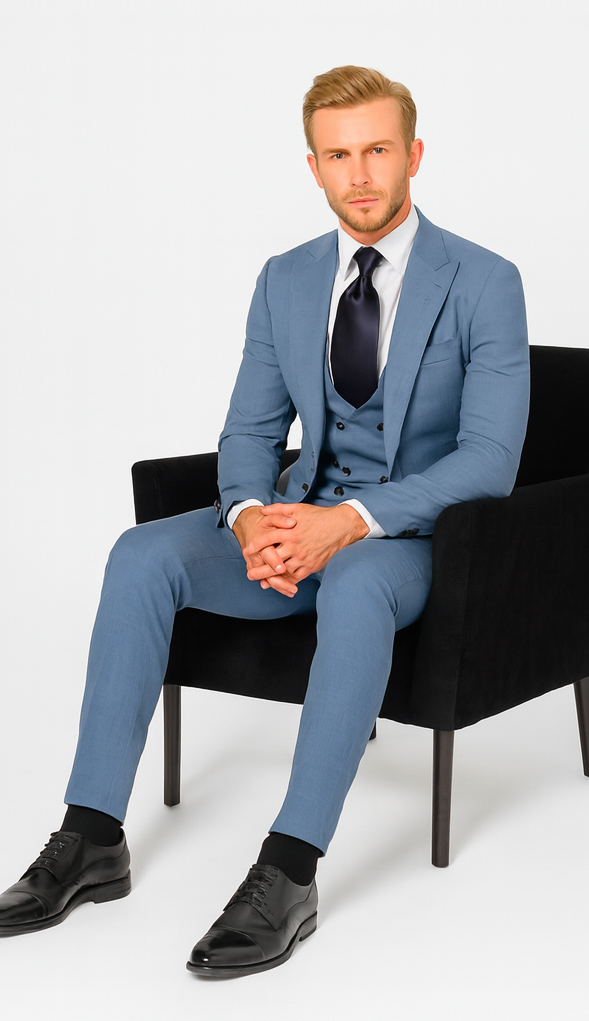 Styling the Rossi Man MAX RM1387 Blue Slim Fit 3-Piece Suit is effortless. For a classic formal look, pair it with a crisp white shirt, a navy or burgundy silk tie, and polished oxford shoes. For weddings, add a pastel shirt, patterned tie, or pocket square to highlight the suit’s rich blue tone. For a modern twist, style it with a turtleneck or loafers to create a sleek, fashion-forward outfit.