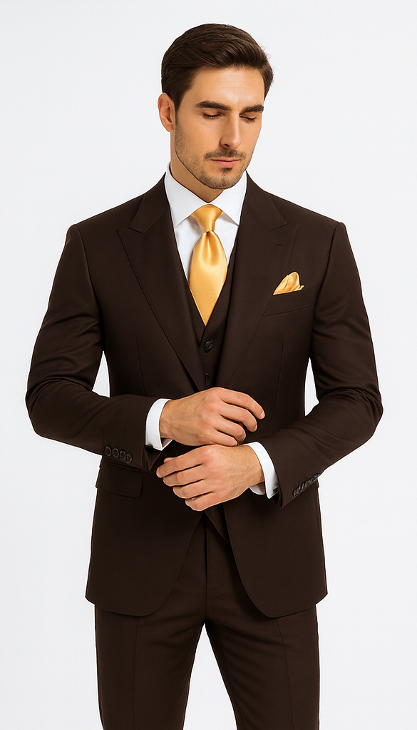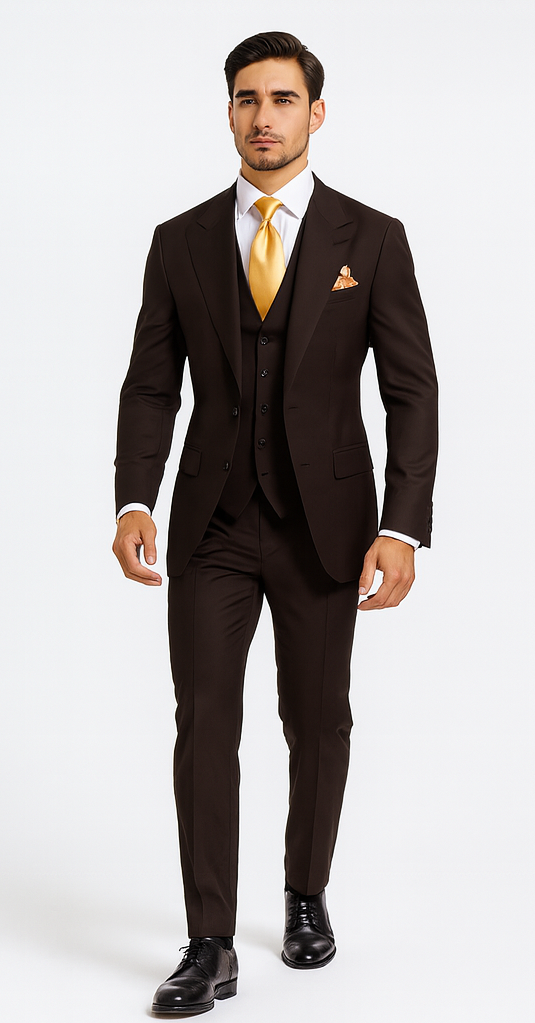The Rossi Man Sam Series RM2303 features a single-breasted, two-button tailored jacket, flat-front trousers, and an optional matching vest for a complete three-piece look. The modern slim-tailored fit contours the body for a sharp and streamlined appearance while maintaining comfort and mobility. Designed with notch lapels, flap pockets, and structured shoulders, this suit reflects impeccable attention to detail — creating a look that’s sophisticated, powerful, and versatile.