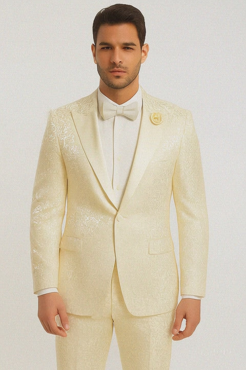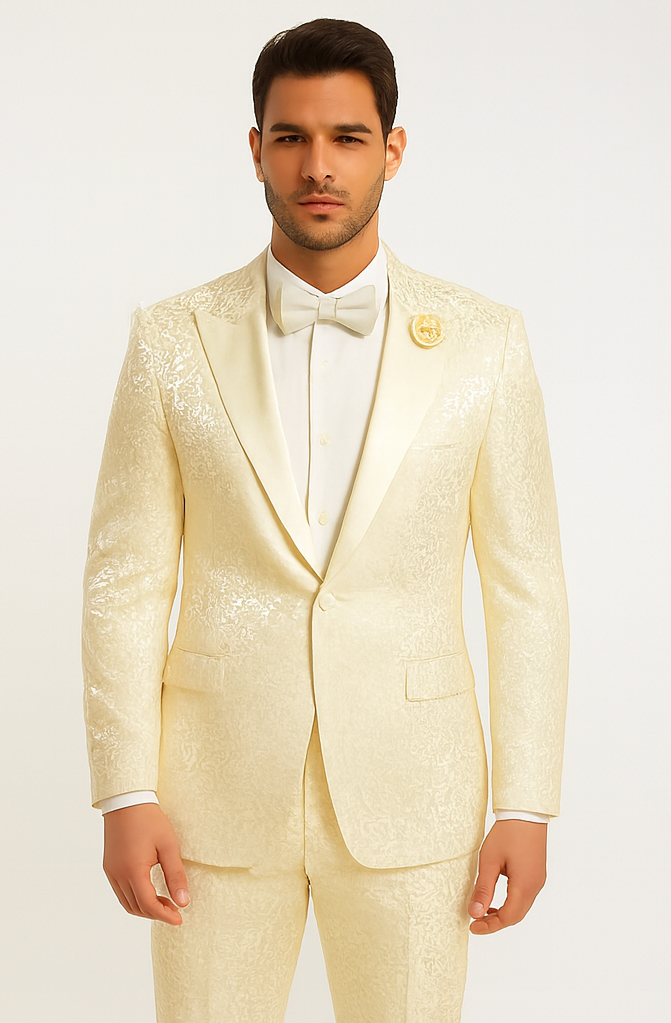 Rossiman Men’s Champagne Ivory Jacquard Paisley Tuxedo – Satin Shawl Lapel