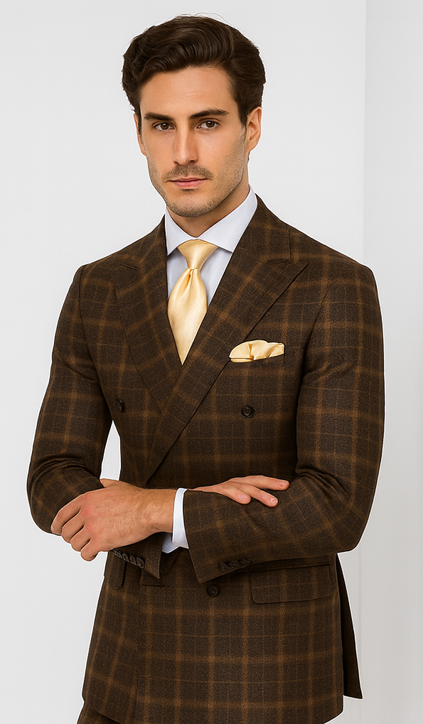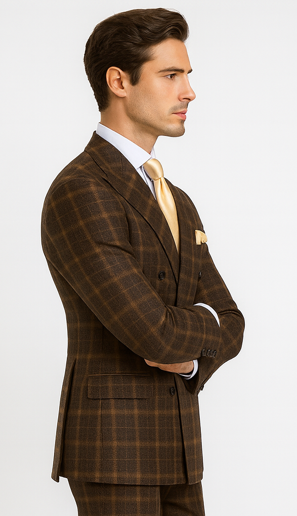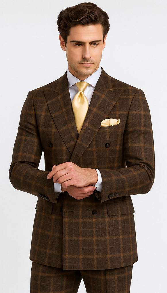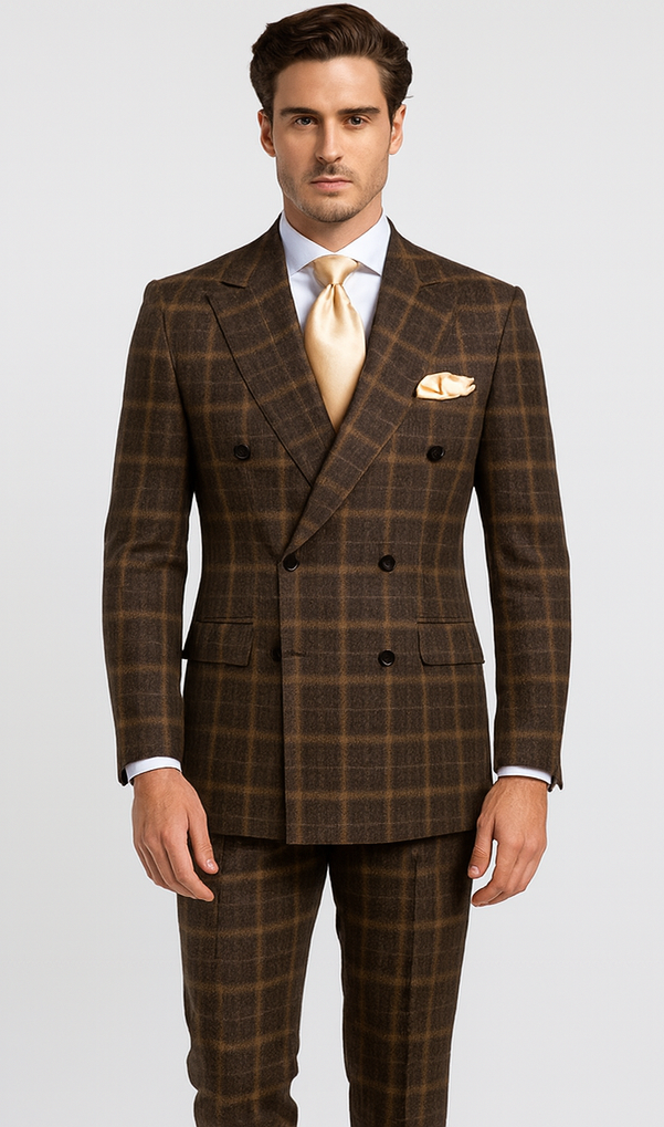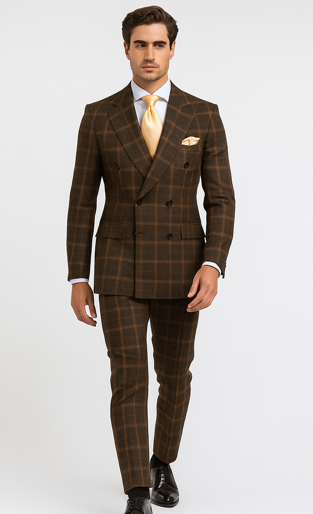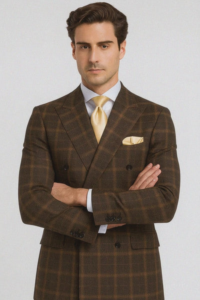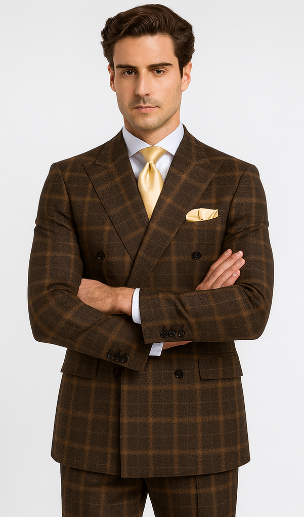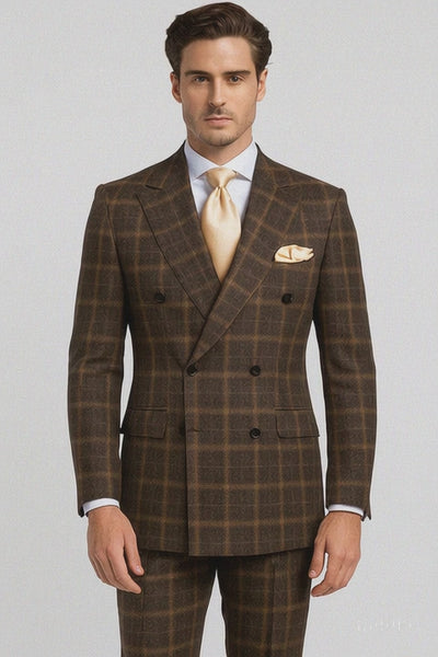 Rossiman Men’s Brown Windowpane Plaid Double-Breasted Wool Suit – Classic Formalwear