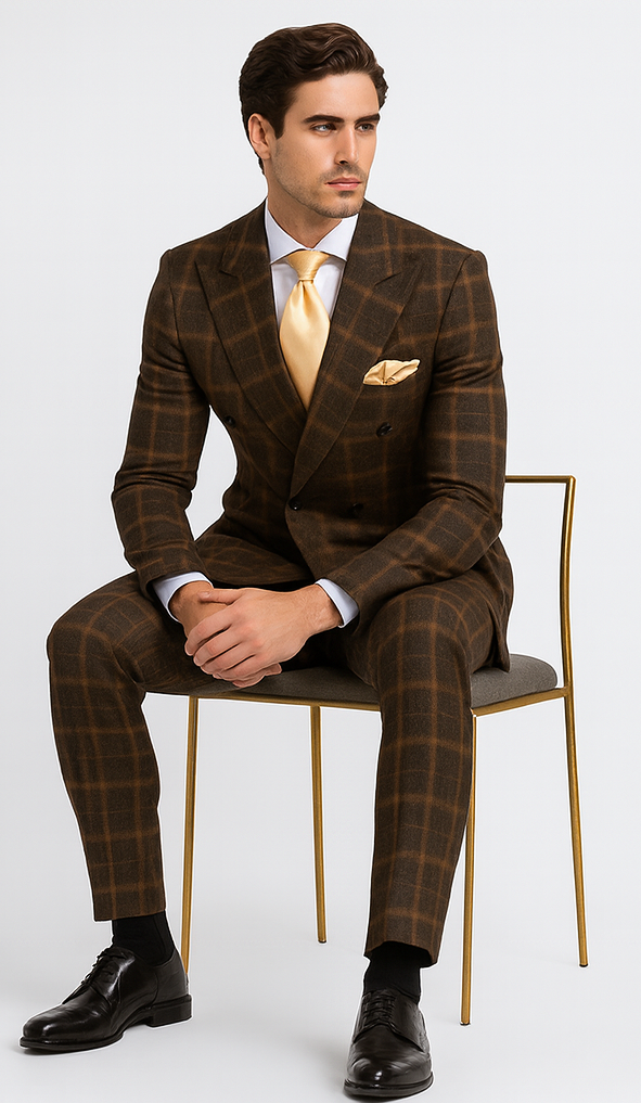 The Rossiman Men’s Brown Windowpane Plaid Double-Breasted Wool Suit is the ultimate expression of refined elegance and timeless style. Designed for modern men who demand sophistication, confidence, and class in every setting, this premium wool suit combines traditional tailoring with contemporary details that make it a standout choice for business, weddings, galas, and upscale events. Crafted from high-quality wool fabric, it provides both durability and breathability, ensuring year-round comfort without compromising on structure or polish.