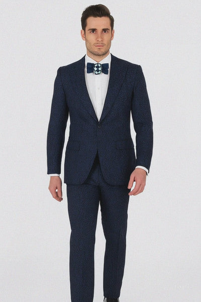 Tailored in a slim fit silhouette, the jacket features a single-breasted design, sharp peak lapels, and structured shoulders, ensuring a masculine and contemporary frame. Details such as flap pockets, a welt chest pocket, and fine stitching highlight Rossiman’s dedication to craftsmanship. The matching slim-fit trousers provide a clean, tapered leg that maintains a modern profile, while an optional vest can add layering versatility for more formal events.