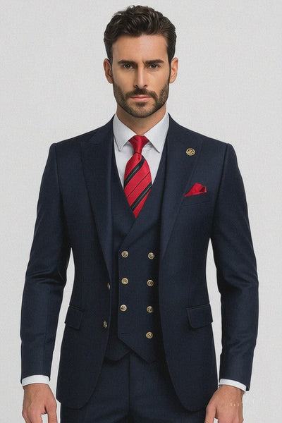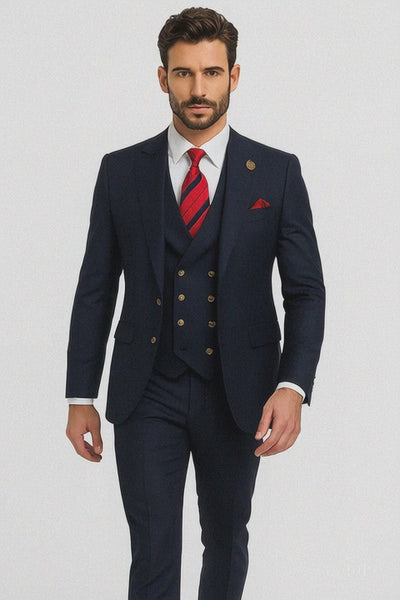 The Rossiman Men’s Navy Blue Suit is a timeless formalwear masterpiece that combines classic tailoring with modern sophistication. Featuring a 1-button peak lapel jacket paired with a double-breasted vest, this suit is designed for men who appreciate sharp detailing, elegant structure, and versatile styling options. Whether for weddings, business functions, evening galas, or upscale social events, this navy blue suit ensures you look polished, confident, and unforgettable.