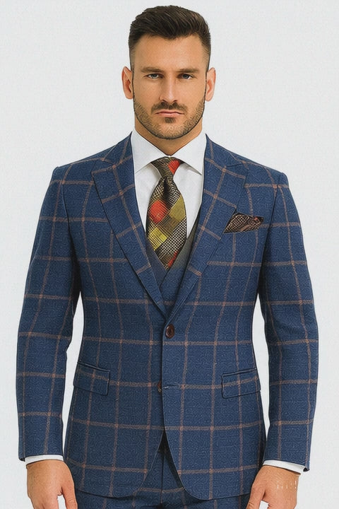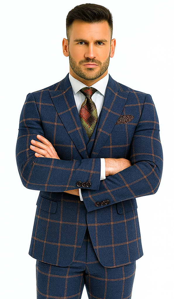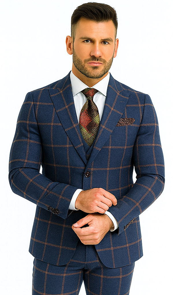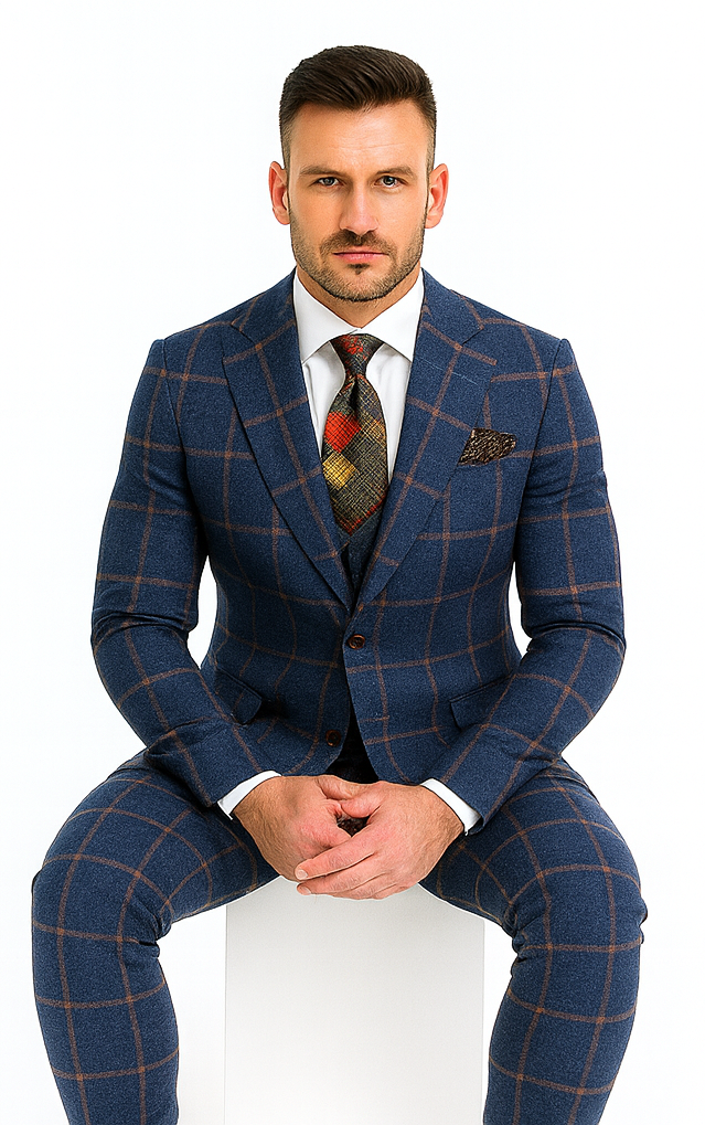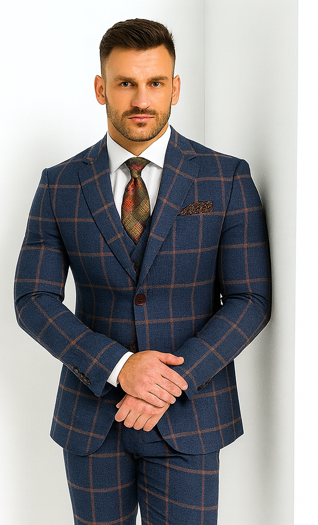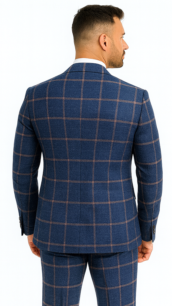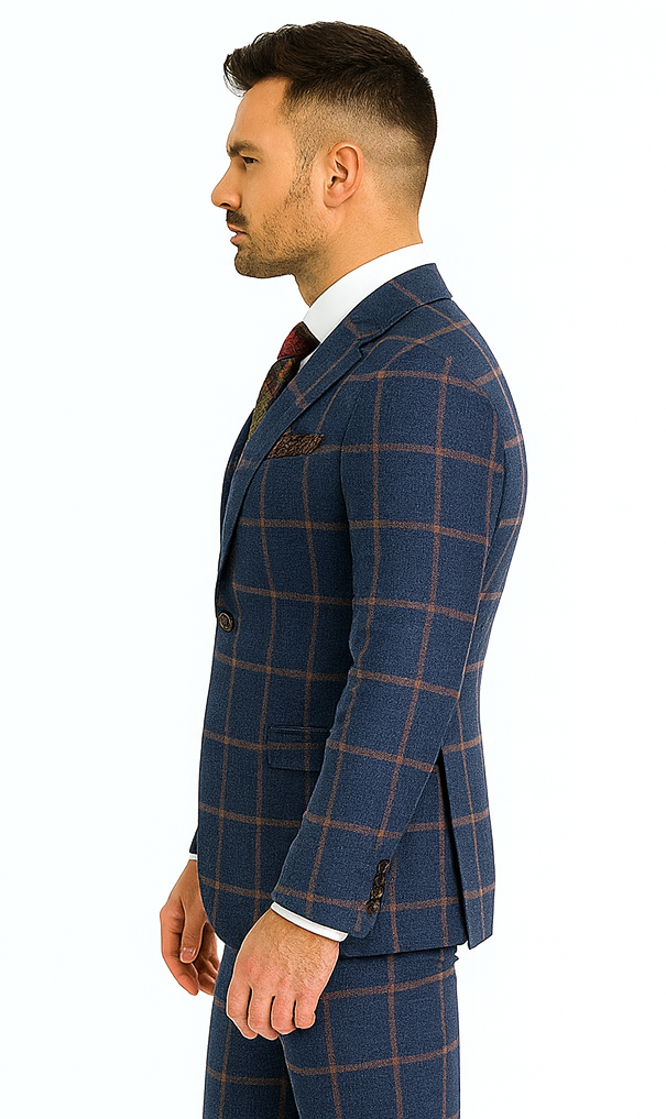 The navy and gray color combination offers a balance of subtlety and distinction. The deep navy base provides a professional, powerful foundation, while the lighter gray windowpane pattern adds texture and dimension. Together, these tones create a suit that is versatile enough for both formal and semi-formal occasions, giving you flexibility in your wardrobe. This makes it an excellent option for professionals seeking a commanding business look or grooms searching for a refined wedding suit.