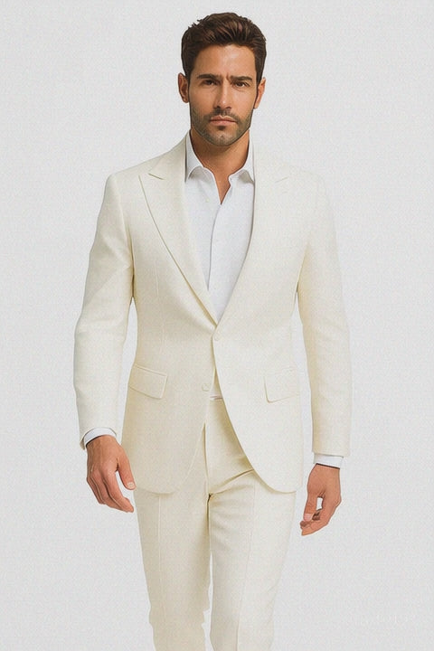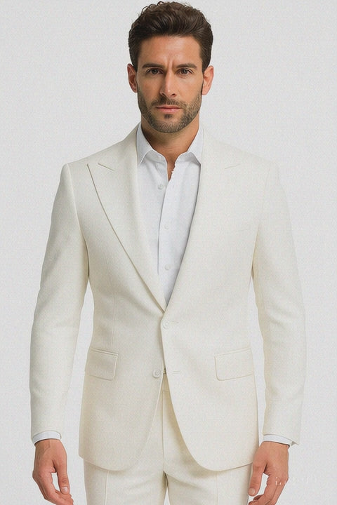 The suit is designed with a peak lapel for a sharp and distinguished silhouette, enhancing both casual and formal warm-weather occasions. Whether you're attending a garden wedding, a summer brunch, or a business event, this suit provides the perfect balance of polished appearance and airy comfort.