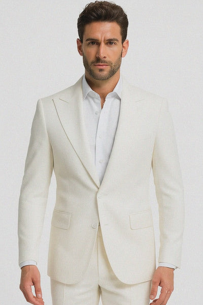 The jacket is designed with a single-breasted cut, peak lapels, structured shoulders, and flap pockets, striking the perfect balance between sophistication and comfort. Its crisp white color brings an air of refinement and freshness, making it especially popular for destination weddings, summer galas, and formal daytime events. The tone-on-tone shadow stripe subtly enhances the fabric with visual depth, ensuring that the suit stands out without being overly bold.