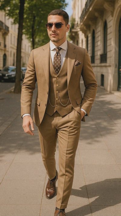 Elevate your style with the Rossiman Tan Suit, a timeless fusion of modern sophistication and classic Italian tailoring. This refined ensemble is crafted for the gentleman who appreciates detail, precision, and undeniable flair.