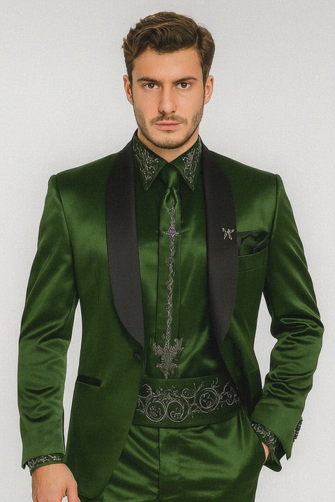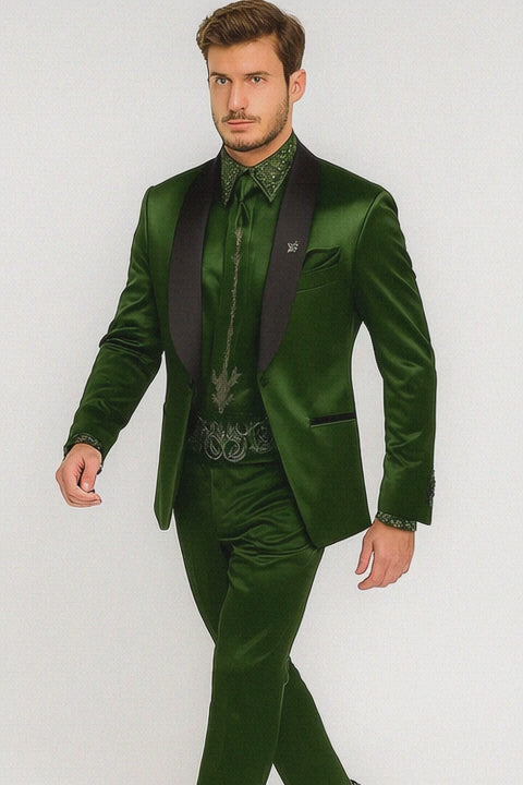 Turn heads and make a bold fashion statement with the Sateen Fabric Suit in Olive Green, a luxurious shiny tuxedo designed for men who want elegance, confidence, and individuality. Perfectly tailored for proms, weddings, formal galas, or any upscale celebration, this tuxedo delivers the ideal balance between timeless sophistication and modern flair. Its rich olive green color combined with the glossy sateen finish makes it an eye-catching alternative to the traditional black or navy suit.