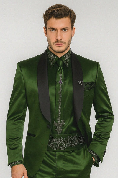 Sateen Fabric Suit - Shiny Tuxedo - Prom Suit - Groom Tuxedos - Olive Green