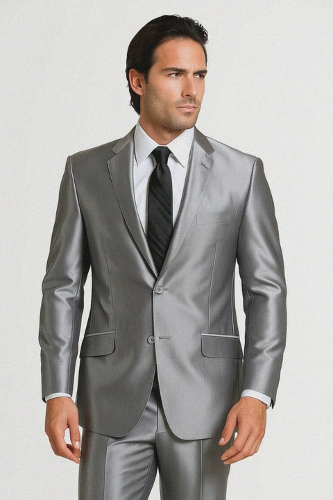 Sateen Metallic Shiny Men's 2 Button Silver Slim Fit Shark Skin Suit Tuxedo looking Men's Sharkskin Suit
