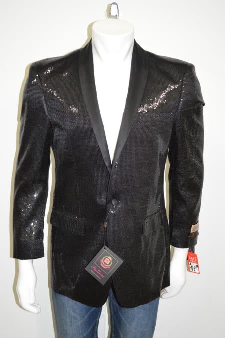 Satin Shiny Sequins One Button Blazer Shawl Collar 100% Polyester Black